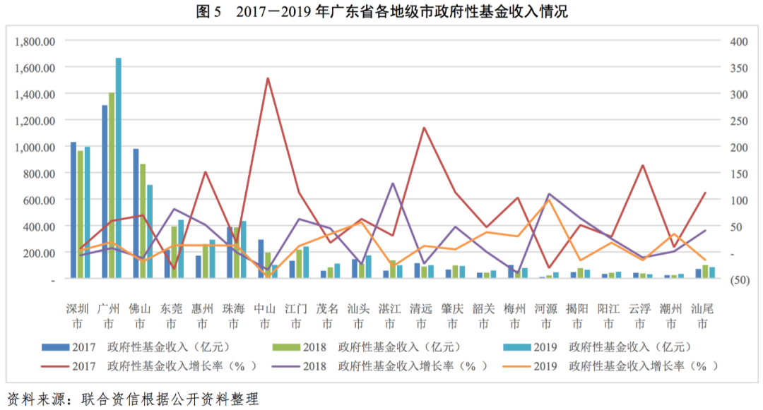從政府性基金收入增速看,近三年廣東省政府性基金收入增長率分別為47.4%、4.7%及3.8%,2017年增長率較高主要受土地出讓金大幅上升影響。各地級市政府性基金收入增速在2017年大幅增長后有所波動,其中中山市下降較快。2019年,河源市、汕頭市和韶關市政府性基金收入的增速較高,其中河源市增速最高,達98.30%。