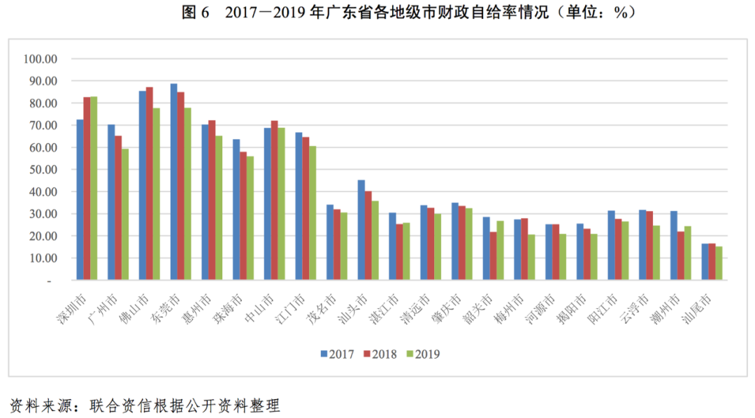 2017-2019年,受減稅降費及增加民生支出影響,除深圳市及中山市財政自給率有所上升外,其余各地級市財政自給率均有所下降;分區域看,除肇慶市外,2019年珠三角地區其余各地級市財政自給率普遍在55%以上,沿海經濟帶及北部生態發展區各地級市財政自給率普遍在40%以下??傮w看,珠三角地區各地級市財政自給能力強,沿海經濟帶及北部生態發展區各地級市財政自給能力偏弱。