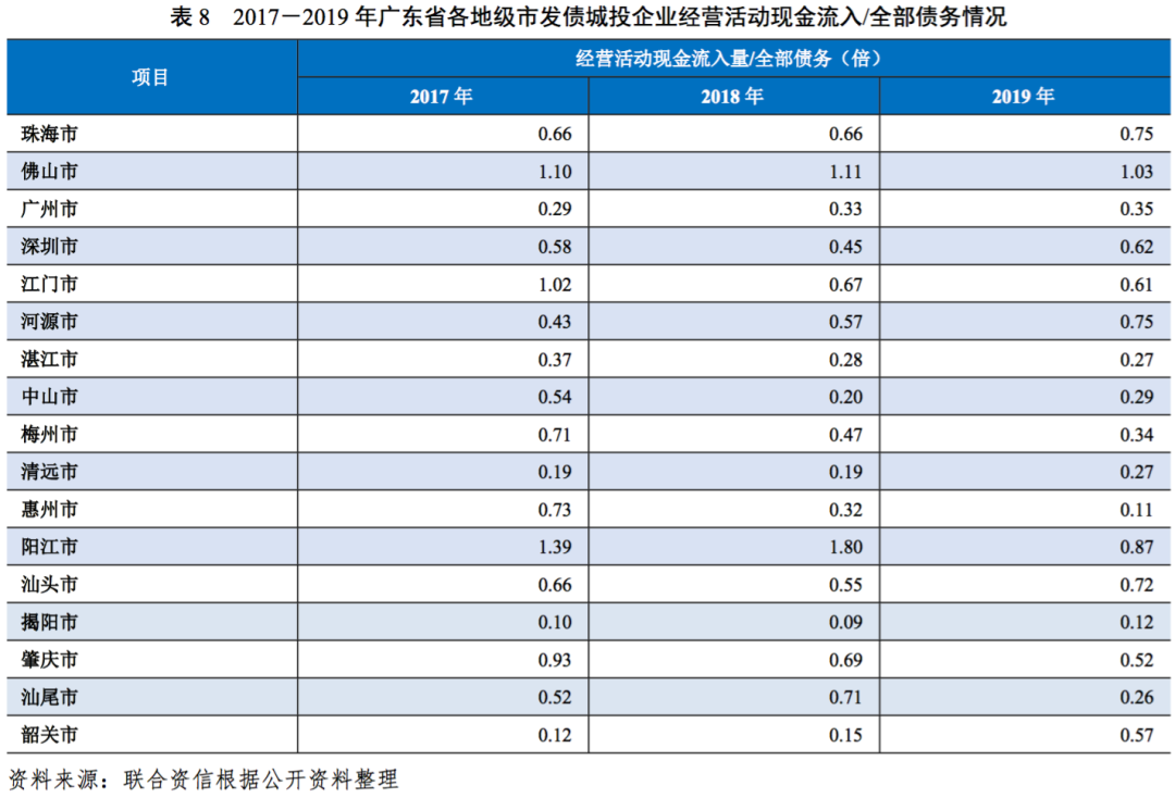 從廣東省各地級市發債城投企業經營活動現金流入量對全部債務的覆蓋情況來看,除佛山市外,其他各地級市發債城投企業經營活動現金流入量對全部債務覆蓋程度均相對較低,債務償還對外部籌資依賴較大。2019年,佛山市發債城投企業經營活動現金流入量/全部債務為1.03倍。