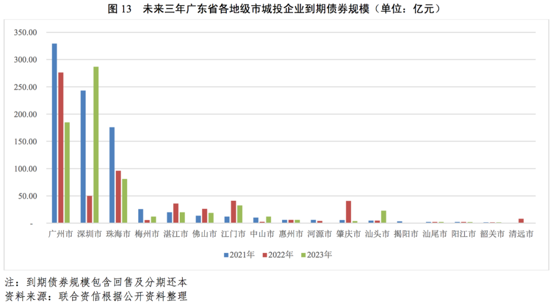 從廣東省各地級市發債城投企業未來三年(2021-2023年)到期債券規???,廣州市、深圳市和珠海市發債城投企業未來三年集中到期債券規模大,其余各地級市發債城投企業到期債券規模相對較小。