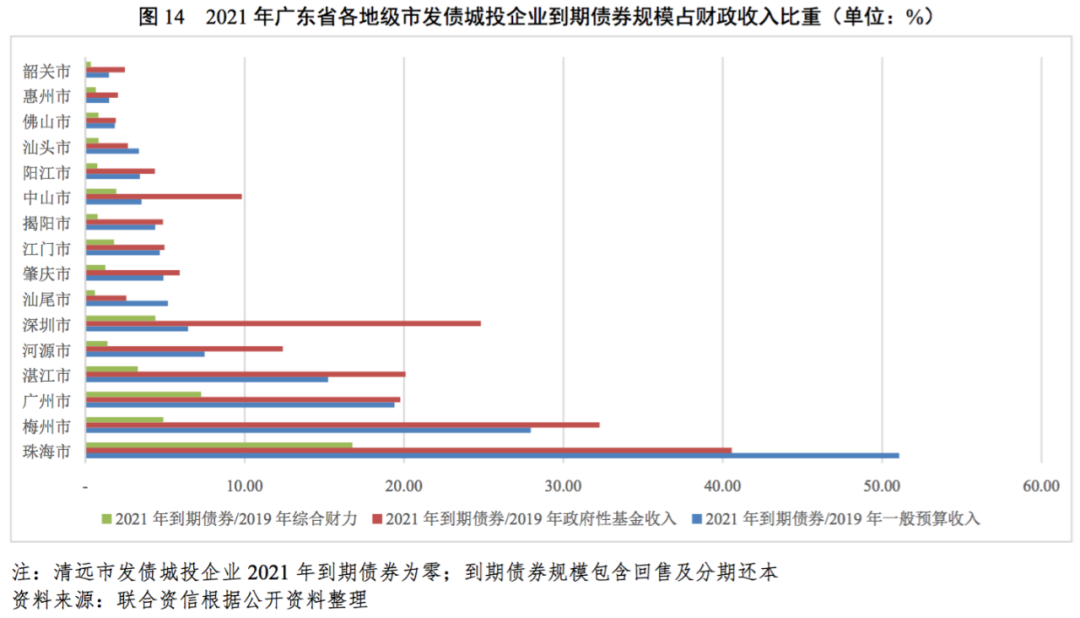 從企業層面看,廣東省發債的城投企業數量較少,發債城投企業中主體信用級別較高的城投企業均集中在粵港澳大灣區。2019年,廣東省發債城投企業的債務負擔同比有所加重,受債務集中到期影響,廣東省各地市的發債城投企業短期償債能力指標有所弱化,償債壓力持續加大。具體來看,珠海市城投企業2021年到期債券規模較大,集中償付壓力較大,地方政府財政收入對“發債城投企業全部債務+地方政府債務”覆蓋程度相對較低。