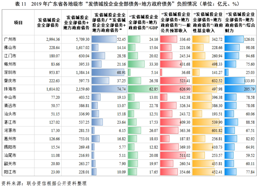 從各地區債務負擔來看,“發債城投企業全部債務+地方政府債務”/GDP較高的地級市為珠海市,2019年底為62.85%,其余各地級市均未超過35%,債務負擔相對較輕。