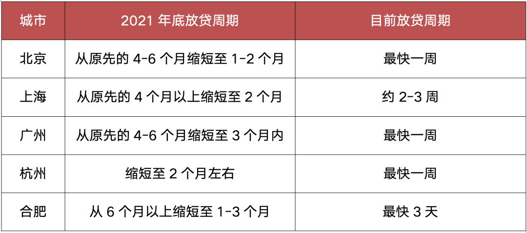 北京在2021年底放貸周期從4-6個(gè)月縮短至1-2個(gè)月的基礎(chǔ)上進(jìn)一步加快,部分銀行一周內(nèi)即可放款。上海房貸發(fā)放審批周期也從2021年底4個(gè)月以上縮短至2個(gè)月的基礎(chǔ)上進(jìn)一步加快,縮短至2-3周。廣州和杭州的個(gè)別銀行也和北京一樣最快一周就能放款。在我們的調(diào)研中,放款時(shí)間最短的是合肥,據(jù)某銀行工作人員表示:“目前我了解到的,肥東這邊有銀行最快可三天放款,當(dāng)然具體的還是得看銀行的要求。”