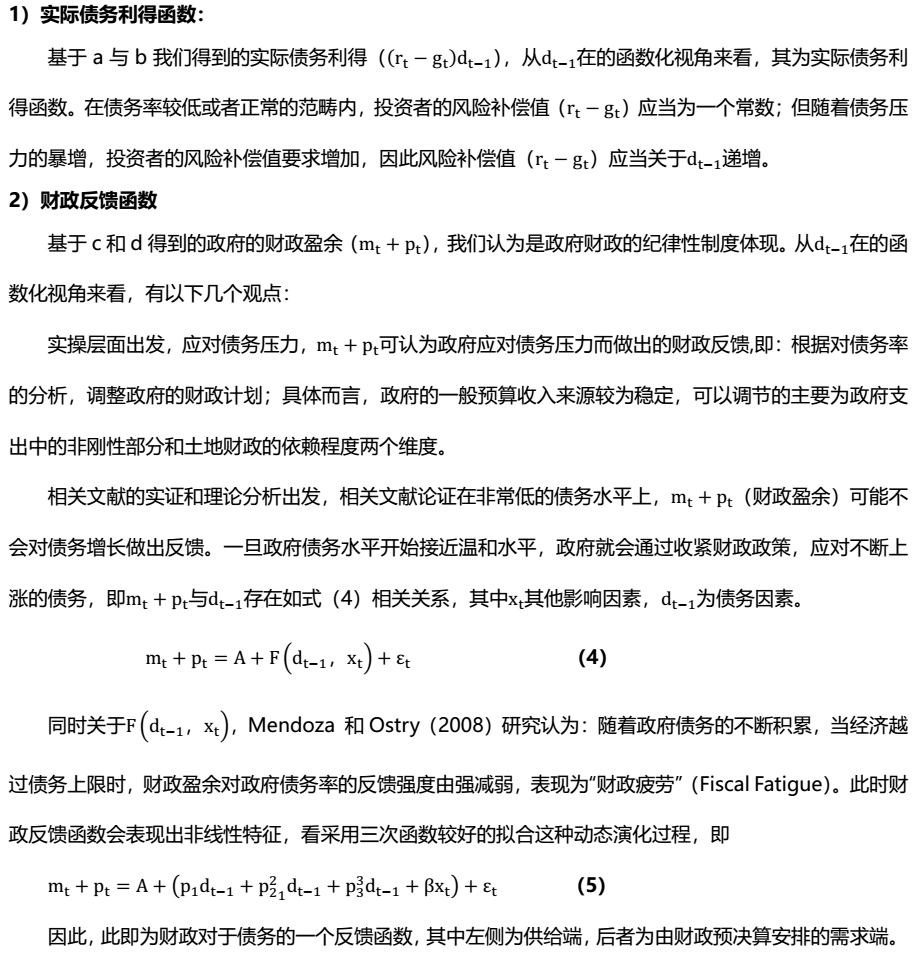 具體來看,我們從財政平衡模型出發(fā),構(gòu)造出實際債務(wù)利得函數(shù)和財政反饋函數(shù),兩者動態(tài)變化下推演債務(wù)率的一個動態(tài)變化過程,點出城投和債務(wù)“明斯基時刻”存在的必然性和具體情形。