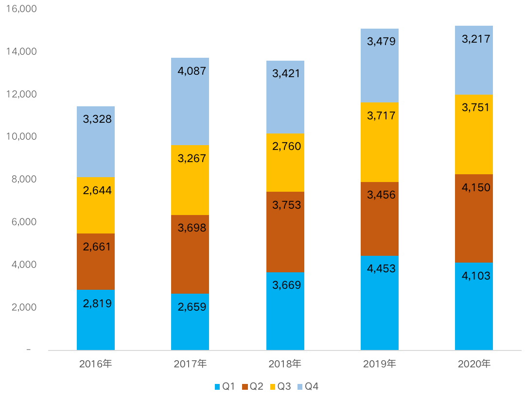 圖:2016-2020年各季度房企融資總量情況(單位:億元)