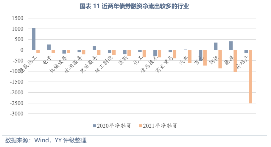 從債券領域來看,2021年凈流出最多的為房地產行業,凈流出2,513億元,而地產行業在過去曾是融資的主力軍,2018年凈融資規模3,587億元,居各行業第一。另外,鋼鐵、能源、有色等重資產傳統行業近年來受落后產能關停、新增產能嚴格受限影響,2021年凈融資流出規模也較大。