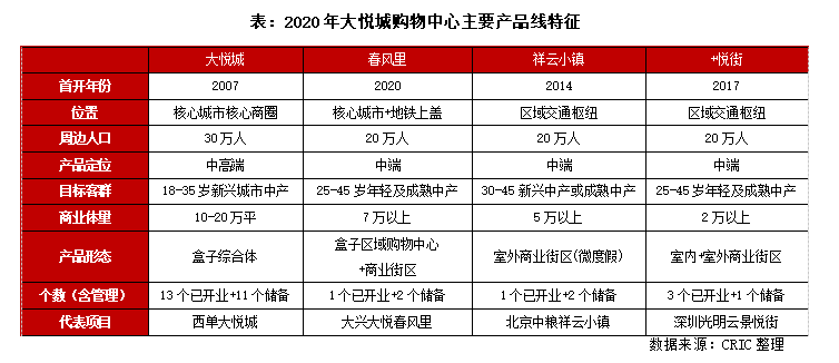客群和產(chǎn)品形態(tài)上,大悅城形態(tài)表現(xiàn)為盒子式,聚焦18-35歲新興中產(chǎn)階級;春風(fēng)里由盒子式購物中心+商業(yè)街區(qū)構(gòu)成,關(guān)注25-45歲年輕及成熟中產(chǎn)群體;而祥云小鎮(zhèn)和+悅街主要是室外商業(yè)街區(qū),分別以30-45歲和25-45歲年輕及成熟中產(chǎn)為核心客群。