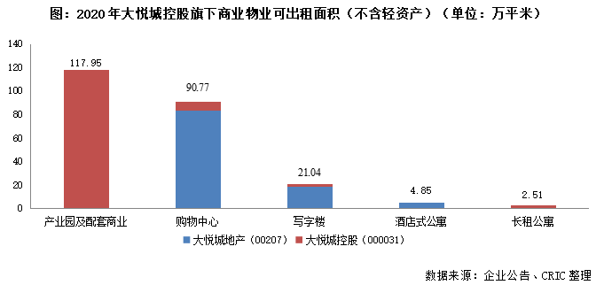 截止2020年底,大悅城控股(000031)旗下重資產(chǎn)在營購物中心項目12個,其中10個為大悅城項目,1個春風(fēng)里項目,1個祥云小鎮(zhèn)項目,總可出租面積達(dá)90.77萬平米;輕資產(chǎn)在營購物中心3個,分別為天津和平大悅城、昆明大悅城及鞍山大悅城。除購物中心外,還擁有在營寫字樓項目5個,總可出租面積21.04萬平米;產(chǎn)業(yè)園及配套商業(yè)5個,總可出租面積117.95萬平米,為各業(yè)態(tài)中出租面積規(guī)模最大的。此外,還有酒店式公寓1個,出租面積達(dá)4.85萬平米;長租公寓5個,出租面積達(dá)2.51萬平米。從大悅城地產(chǎn)(00207)來看,其擁有除祥云小鎮(zhèn)外的11個購物中心項目,可出租面積83.26萬平米;5個寫字樓中的4個,可出租面積達(dá)18.5萬平米;以及1個酒店式公寓。