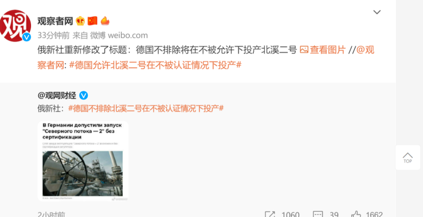 據觀察者網最新消息,俄新社發布了一條新聞“德國不排除北溪二號在不被認證情況下投產”,不久后俄新社重新修改了標題:“德國不排除將在不被允許下投產北溪二號。”