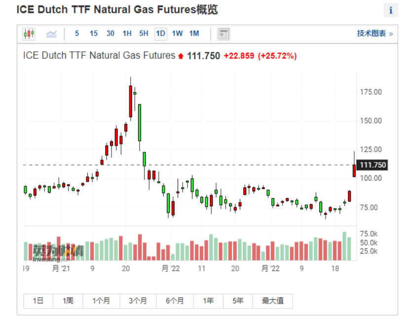 2/24日,普京宣稱在頓巴斯地區進行特別軍事行動。受此影響,天然氣盤中迅速飆升,被視為“歐洲天然氣價格風向標”的荷蘭TTF天然氣期貨價格較前一個交易日暴漲25.72%,漲幅甚至一度超過35%。