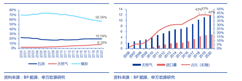 在近幾年煤改氣的政策推動下,中國天然氣的消費占比一直在持續提高,2020年約占8.2%。