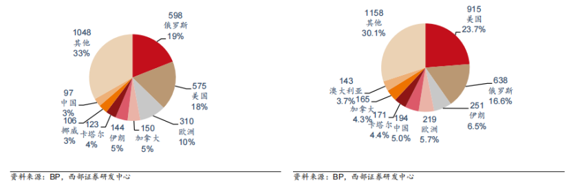 全球天然氣供應格局過去十年受頁巖油革命推動,新增了美國這一大供給。美國、俄羅斯和伊朗是目前主要天然氣生產地,占比分別為23.7%/16.5%/6.5%。