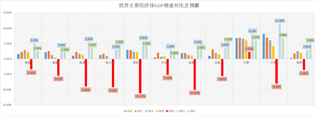 上圖是國際貨幣基金組織對于過去五年及未來兩年GDP增速的對比與預測。國際貨幣基金組織認為:新冠疫情對2020年全球經濟、貿易和民生均產生較大影響,2020年全球GDP預計將同比實際縮減3.5%。中國 GDP增速表現在全球一枝獨秀,很有可能是全球主要經濟體里唯一正增長的國家。