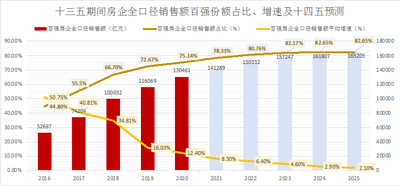 • 參照十三五期間百強房企銷售額占比,十四五期間百強房企銷售額市場份額仍將繼續上升,預計還有約10%的增長空間;