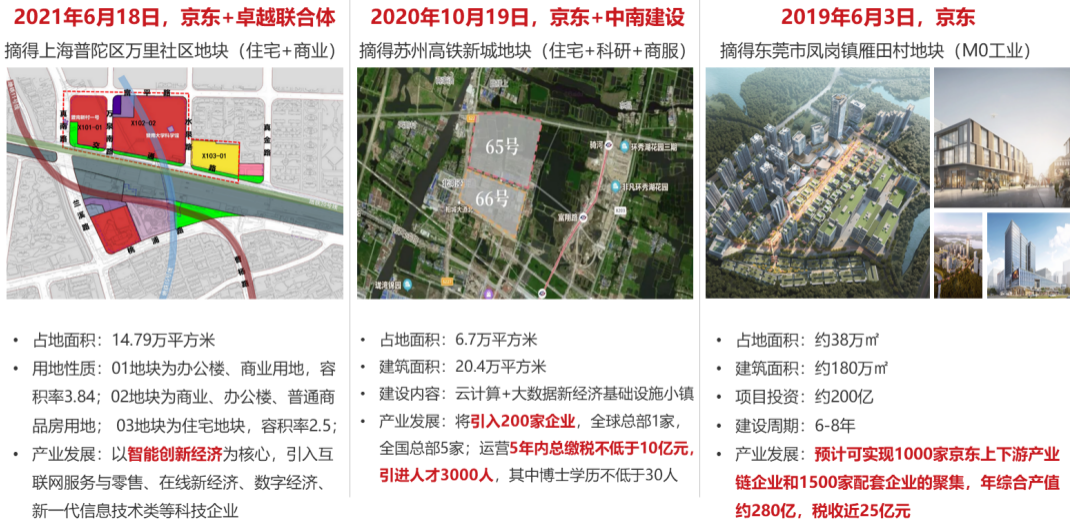 2021年6月,京東和卓越形成的聯合體以99.1億元成功摘得上海普陀區萬里社區地塊,該項目由3個地塊組成,其中X101-01地塊為辦公、商業用地,容積率3.84;X101-02地塊為商業、辦公、普通商品房用地,項目將以智能創新經濟為核心,引入互聯網服務與零售、在線新經濟、數字經濟、新一代信息技術類等科技企業。