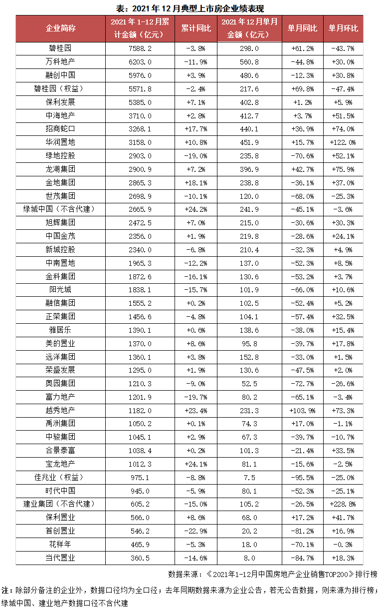 從企業(yè)表現(xiàn)來看,38家典型上市房企中,12月超7成房企單月業(yè)績同比降低,其中近半數(shù)房企同比降幅大于40%,9家房企單月業(yè)績同環(huán)比雙降。僅碧桂園、招商、華潤、龍湖、越秀等實現(xiàn)了較高的單月業(yè)績同比增長。截至12月末,38家典型上市房企中有18家企業(yè)累計業(yè)績同比負(fù)增長,銷售規(guī)模負(fù)增長的企業(yè)數(shù)量較2020年有明顯提升。