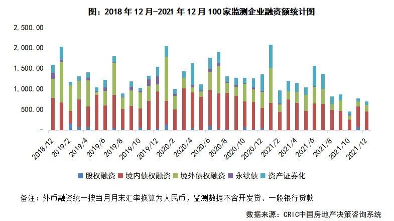 融資總量:2021年12月100家典型房企的融資總量為702.21億元,環(huán)比下降10%,同比下降48%。房企融資“冰凍”解封雖得以推進(jìn),但當(dāng)前機(jī)構(gòu)融資仍是偏向財務(wù)狀況較好的房企,12月融資量仍屬于年內(nèi)低位。從融資結(jié)構(gòu)來看,境內(nèi)債權(quán)融資434.05億元,環(huán)比下降13.5%,同比下降11.1%;境外債權(quán)融資166.52億元,環(huán)比上升35.0%,同比下降58.1%;本月資產(chǎn)證券化融資82.57億元,環(huán)比上升4.9%,同比下降79.6%。而全年來看,全年融資量13038億元,同比下降26%,近五年來融資量首次出現(xiàn)負(fù)增長,同時達(dá)到五年來最低點。其中,2021下半年以來,受房企商票違約、債券違約等多方面的影響,房企的融資量8月以后均不足千億元。