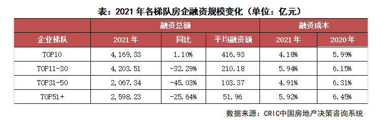 企業(yè)表現(xiàn):本月融資總量最高的企業(yè)為華潤置地,融資總量約83.61億元,主要是發(fā)行了25億元的公司債,此外進(jìn)行了多筆境外銀行貸款,還發(fā)行了資產(chǎn)證券化產(chǎn)品。從企業(yè)梯隊來看,2021年月平均額最大為TOP10房企,平均融資額416.93億元,融資總額同比上升1.10%,唯一一個同比上漲的梯隊;TOP31-50梯隊融資總額同比降幅最大,降幅達(dá)到45.03%。成本來看,4個梯隊均同比下降,其中TOP10梯隊降幅最大達(dá)到1.81pct,其融資成本也最低,為4.18%。