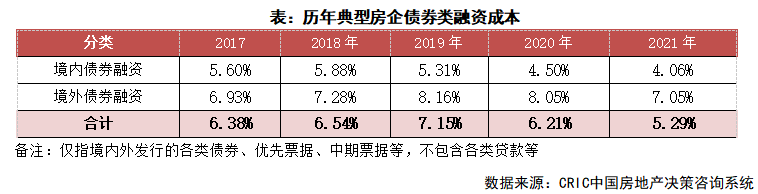 融資成本:2021年100家典型房企新增債券類1融資成本5.29%,同比下降0.93pct,其中境外債券融資成本達(dá)7.05%,下降1.01 pct,境內(nèi)債券融資成本4.06%,下降0.43 pct。單月來看,12月房企融資成本4.52%,環(huán)比上升0.72pct,同比下降2.40pct。其中境外融資成本7.02%,環(huán)比下降6.48pct;境內(nèi)融資成本3.73%,環(huán)比上升0.31 pct,同比下降1.47pct。境內(nèi)發(fā)債的企業(yè)中,融資利率在2.98%-6.80%間,政策的密集發(fā)聲下房企發(fā)債有所松綁,更多的企業(yè)可以進(jìn)行發(fā)債,是以成本區(qū)間有所擴(kuò)大。