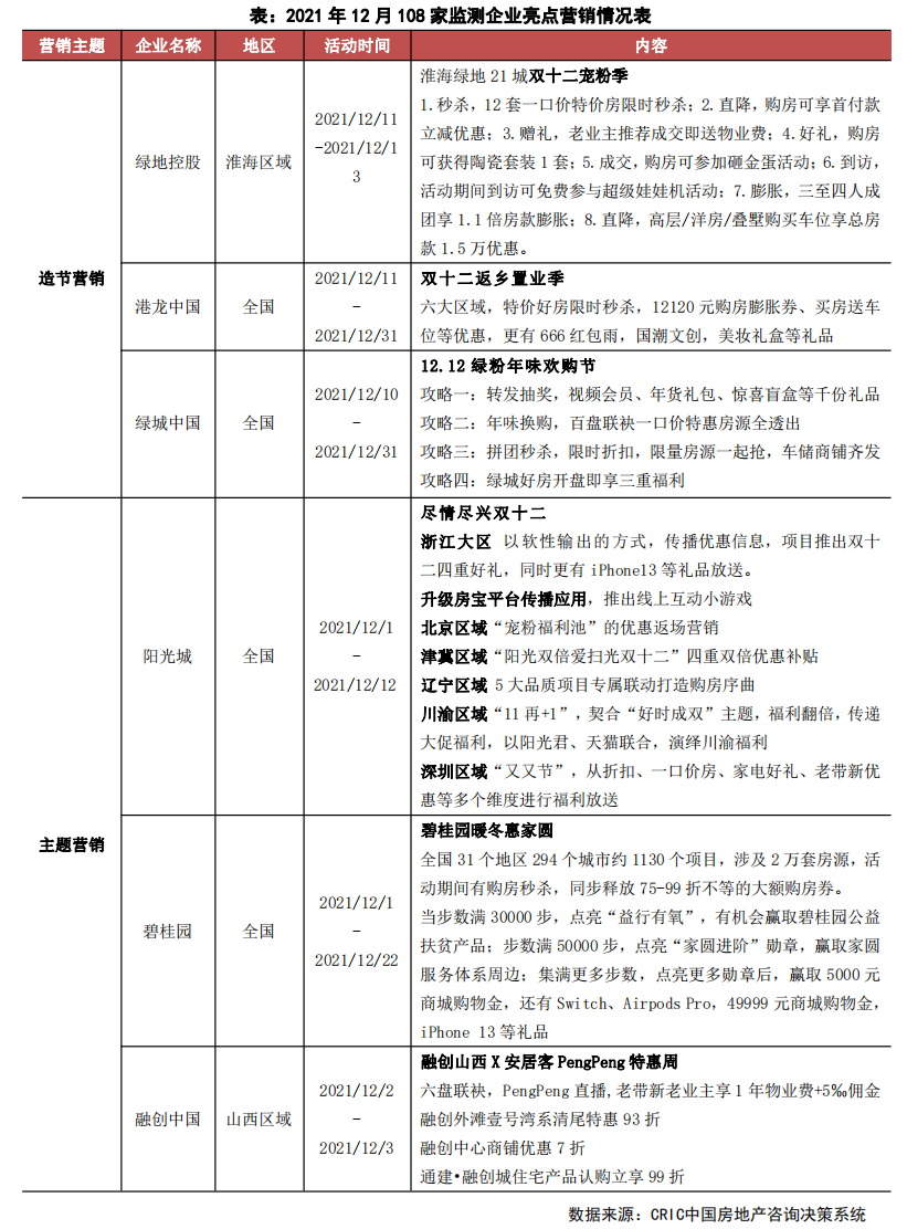 臨近年末,房企把握雙十二和年終節(jié)點,以造節(jié)和主題活動為主要載體推出營銷活動。從市場來看,12月市場略有回升,29個重點監(jiān)測城市商品住宅成交面積環(huán)比增長16%,同比下降35%。其中,一線城市穩(wěn)步修復(fù),成交環(huán)比增長6%,同比仍下降30%。25個二、三線城市企穩(wěn)回升,環(huán)比增長19%、同比仍跌36%。從營銷來看,本月房企營銷仍然積極,臨近年末,碧桂園、綠地、綠城、融創(chuàng)等一眾房企紛紛推出了雙十二和年終營銷活動,形式上仍然以造節(jié)和主題活動為主。