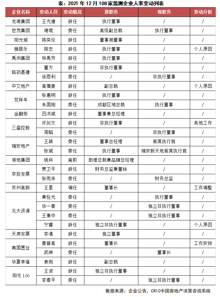 12月,房企高層人事動態(tài)信息數(shù)量較前一月基本持平,從108家監(jiān)測企業(yè)的人事變動情況來看,房企對組織架構(gòu)的調(diào)整仍在繼續(xù),管理層的重整仍在深化,加之年終節(jié)點,高層大范圍變動時有發(fā)生。