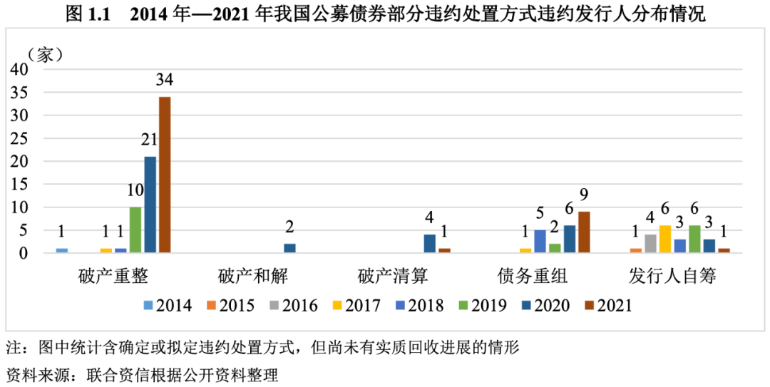 2021年共有34家發行人采用破產重整方式進行違約處置,較上年(21家)大幅增長。從破產重整處置進程來看,截至2021年末,有2家發行人擬進行破產重整,已向法院提交破產重整申請,13家發行人被法院裁定破產重整,17家發行人正在執行重整計劃,2家發行人重整計劃執行完畢并被法院裁定終結破產程序。