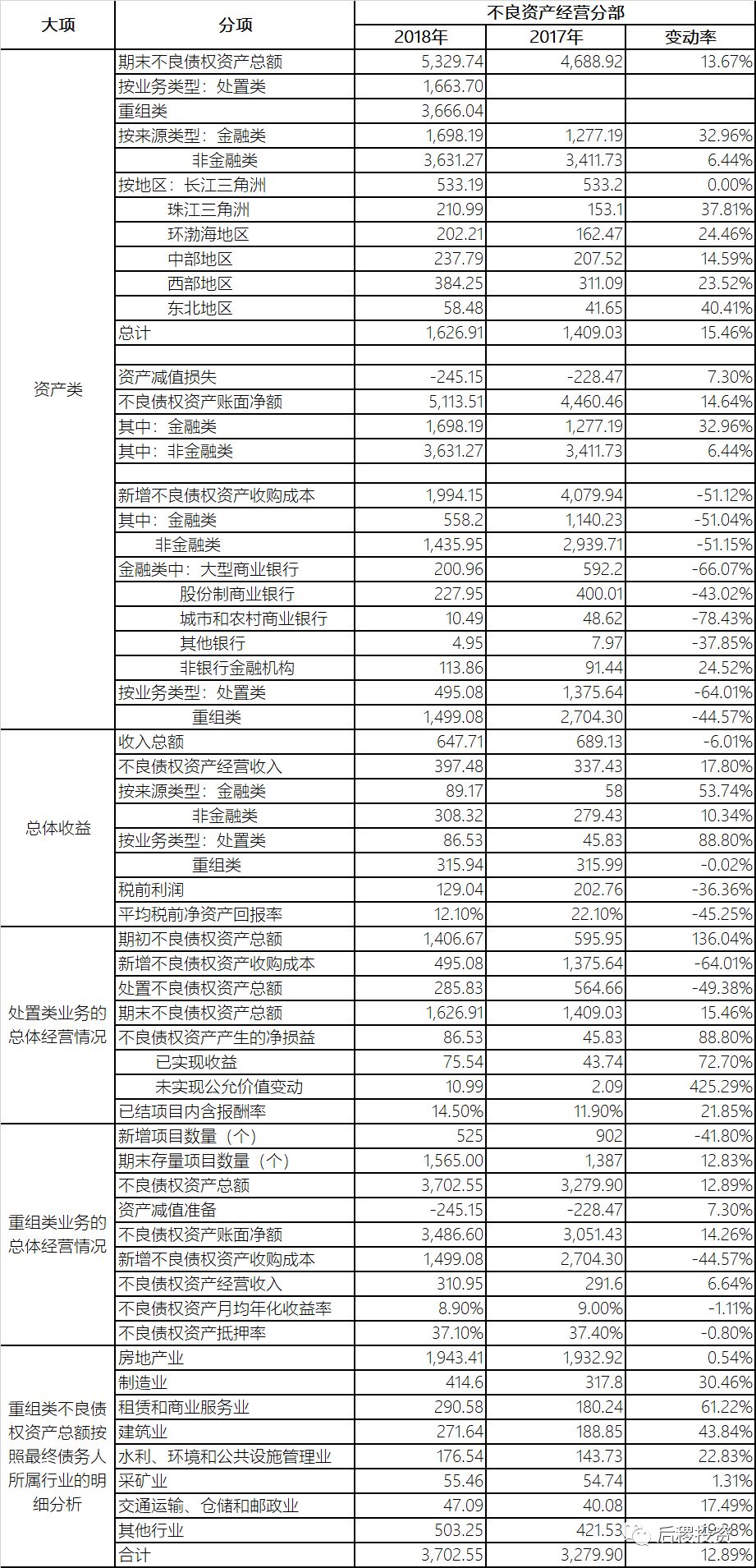 a.    期末不良債權資產總額5329.74億,增長13.67%,其中處置類占比31.2%,非金類債權越占比68%,比重較2017年有明顯下降,顯示出華融進一步聚焦主業的傾向。