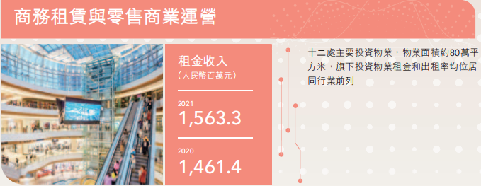 商務(wù)租賃與零售商業(yè)運(yùn)營(yíng)方面,相關(guān)項(xiàng)目的運(yùn)營(yíng)收入為15.633億元,占總收入的2%,同比增長(zhǎng)7%。各寫(xiě)字樓項(xiàng)目租賃情況良好,出租率基本保持高位。零售商業(yè)方面,受疫情影響,雖然營(yíng)業(yè)業(yè)績(jī)有所增長(zhǎng)趨勢(shì),但客流較疫情前仍有差距。