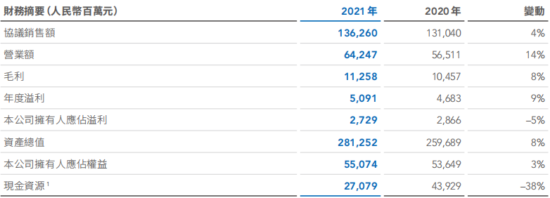 報(bào)告期間內(nèi)全年?duì)I業(yè)收入約為人民幣573.8億元,同比上升24.1%;核心凈利潤(rùn)約為人民幣41.5億元,同比上升3.2%。毛利率為21.8%,同比下降3.3個(gè)百分點(diǎn)。