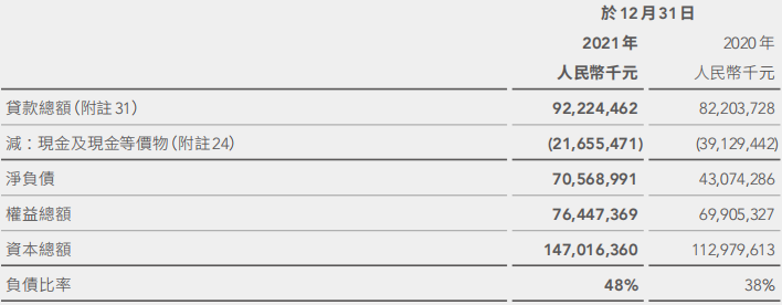 報(bào)告期間內(nèi),截至2021年末,碧桂園總有息負(fù)債下降至3179.2億元,凈負(fù)債率45.4%,同比優(yōu)化10.2個(gè)百分點(diǎn)。凈負(fù)債率、現(xiàn)金短債比均優(yōu)于“三道紅線(xiàn)”要求,且處在行業(yè)較優(yōu)水平,剔除預(yù)收賬款的資產(chǎn)負(fù)債率也從2020年底的80%下降至74%。