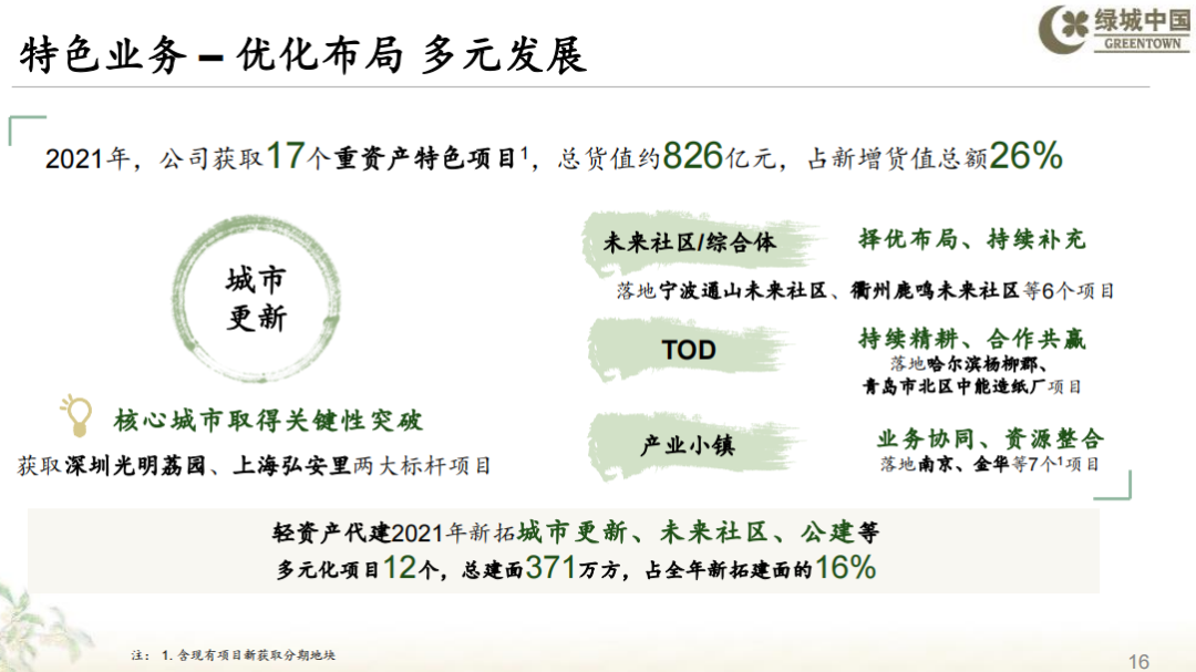 2021年,集團(tuán)共獲取17個(gè)重資產(chǎn)特色特質(zhì)項(xiàng)目,總貨值約人民幣826億元,占新增貨值總額26%。城市更新業(yè)務(wù)取得突破進(jìn)展,獲取了深圳光明荔園和上海弘安里兩個(gè)代表性項(xiàng)目;城市綜合體、未來(lái)社區(qū)業(yè)務(wù)多點(diǎn)開(kāi)花,落地寧波通山未來(lái)社區(qū)、衢州鹿鳴未來(lái)社區(qū)等6個(gè)項(xiàng)目;產(chǎn)業(yè)小鎮(zhèn)和TOD項(xiàng)目持續(xù)落地。