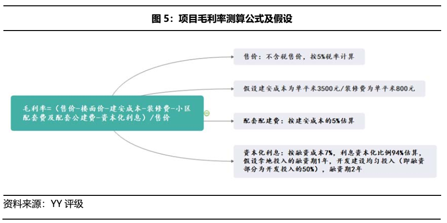 禹洲過去幾年拿的高地價項目遭遇后續限價導致毛利率不理想,根據我們的測算,這些低毛利項目結轉是造成利潤大跌的最主要原因。首先,我們按下圖毛利率簡易公式及假設,對公司2020年結轉的項目的毛利進行估算。