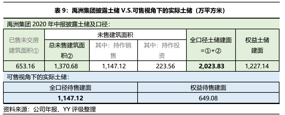 截至2020年12月31日,公司披露的總土儲為2,310萬平方米,總貨值約4,559億元,權益占比62%,并表比例60%,看起來充裕。但根據我們之前報告中對于禹洲中報披露的土儲口徑的拆分(公司2020年中報披露土儲全口徑為2023.83萬平方米,實際可售部分為1,147.12萬平方米,即打六折)來推測,公司實際可售土儲并不如看起來豐厚,若簡單粗暴按照六折估計,再乘以權益比(合作開發占比較大),則權益土儲約785萬平方米,有效貨值則為1,700億元(此為線性外推,仍以后續公司披露的土儲明細為準)。