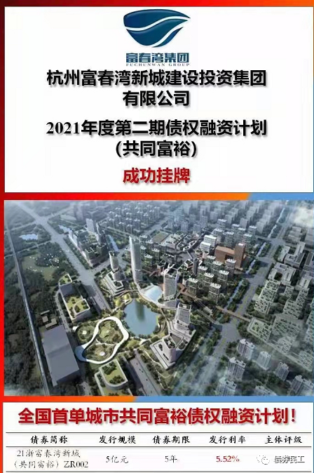 根據發行海報,杭州富春灣新城建設投資集團有限公司(以下簡稱“富春灣建投”)于2021年12月10日成功發行了2021年度第二期債權融資計劃(共同富裕)。本期債權融資計劃發行規模為5億元,發行期限為5年,為全國首單城市共同富裕債權融資計劃。
