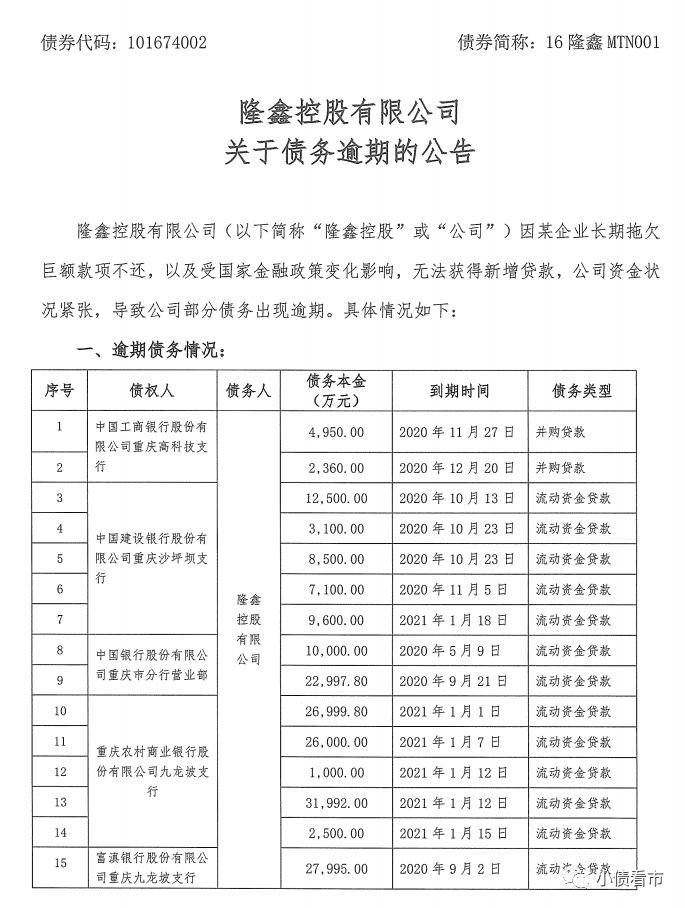 公告顯示,隆鑫控股逾期債務(wù)多達(dá)32筆,涉及工行、中行等十余家金融機(jī)構(gòu),債務(wù)多數(shù)已于去年到期。