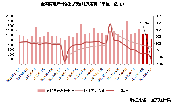 據國家統計局數據:2021年,全國房地產開發投資14.8萬億元,比上年增長4.4%。12月單月完成開發投資額僅10288億元,同比下降13.9%,為4年同期新低。