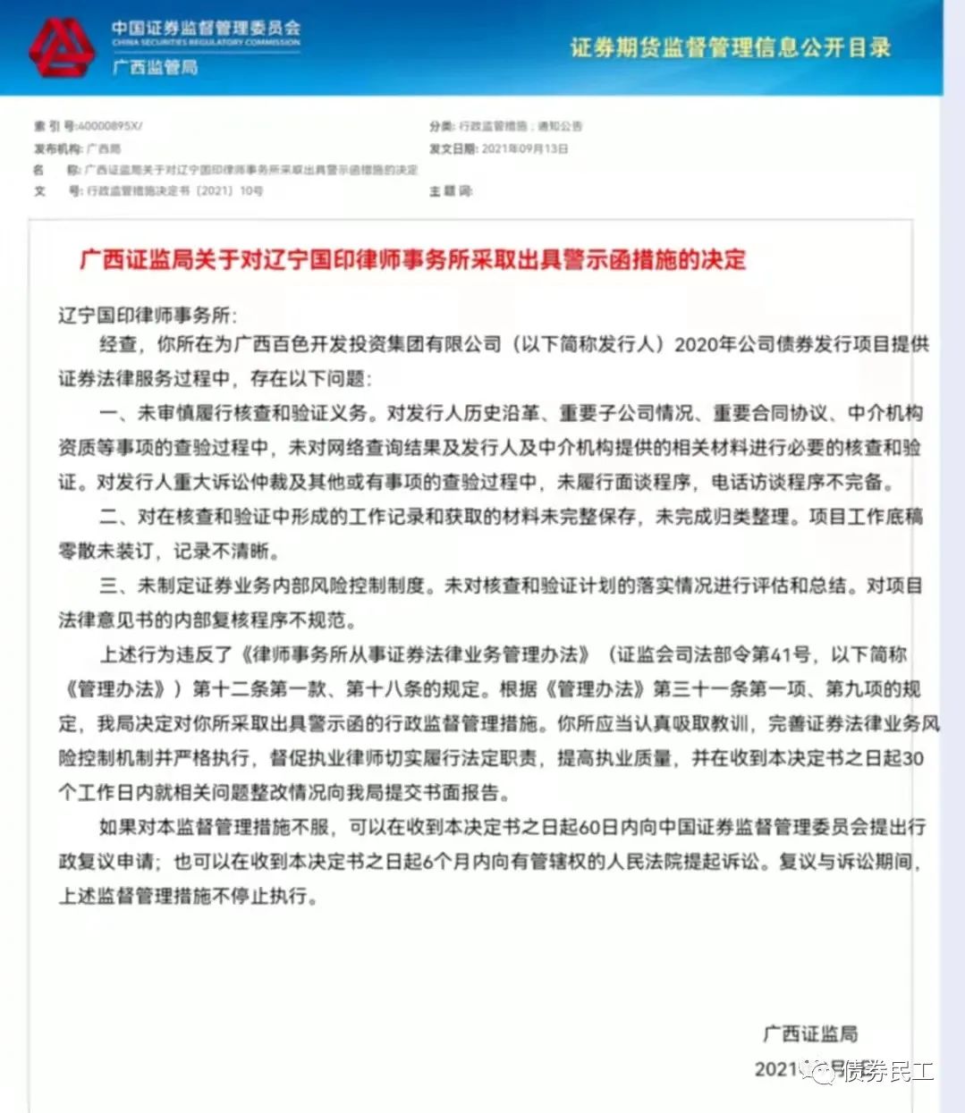 根據(jù)廣西證監(jiān)局2021年9月13日披露的公開信息,遼寧國印律師事務(wù)所因為在廣西百色開發(fā)投資集團有限公司2020年公司債券發(fā)行項目中存在未審慎履行核查和驗證義務(wù)、未完整保存和歸類整理盡調(diào)底稿、未制定證券業(yè)務(wù)內(nèi)部風險控制制度等問題,被廣西證監(jiān)局采取出具警示函措施。根據(jù)公開信息,遼寧國印律師事務(wù)所為“20百投01”、“20百投02”和“20百投03”提供了證券法律法務(wù)。