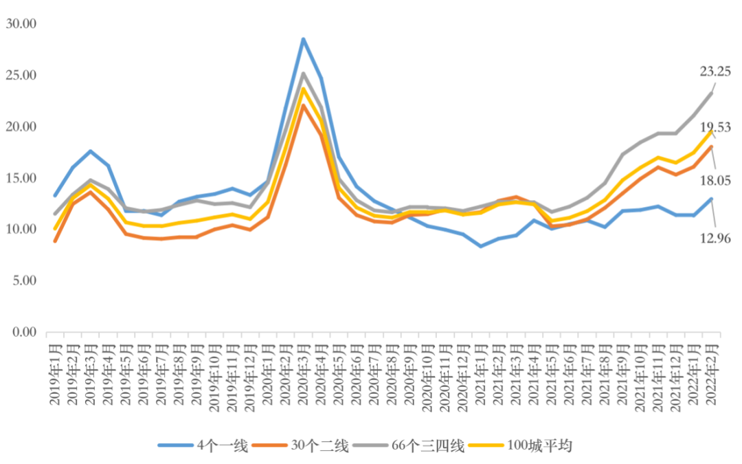 三四線城市形勢更為嚴峻,去化周期高達23.25個月,已經逐步迫近2020年疫情期間水平,環比上月大幅上漲10%。