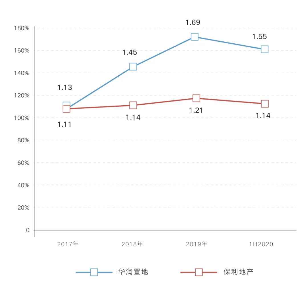 過去,頭部房企在規(guī)模化擴張過程中,傾向于借助預收賬款撬動企業(yè)經營杠桿,以達到滿足經濟資金需求和優(yōu)化財務指標的目的,以華潤、保利為例,近年來預售賬款債務比持續(xù)提升,一定程度上達到了財務杠桿穩(wěn)健的目標。