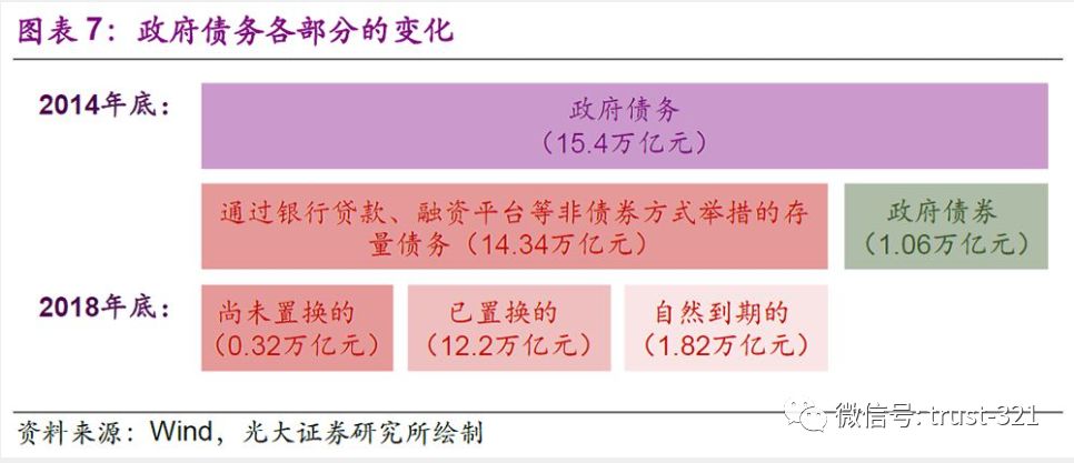 下面是截止2018年底ZF債務(wù)規(guī)模的構(gòu)成。經(jīng)過(guò)4年置換后,原先2014年底認(rèn)定的15.4萬(wàn)億可置換ZF存量債務(wù)中,只剩下3200億債務(wù)是以非地方債形式存在,也意味著置換債就這么大存量發(fā)行空間了。