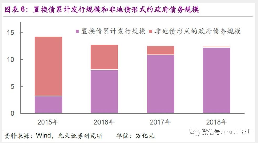 說(shuō)白了,就是把債權(quán)形式變了,以前是借融資平臺(tái)貸款,現(xiàn)在變成ZF直接作為債務(wù)人的ZF債,給3年時(shí)間完成。截止到2018年底,3年時(shí)間共發(fā)行了12.2萬(wàn)億元的地方ZF置換債,平均每年3萬(wàn)億左右,購(gòu)買者主要是商業(yè)銀行為主。