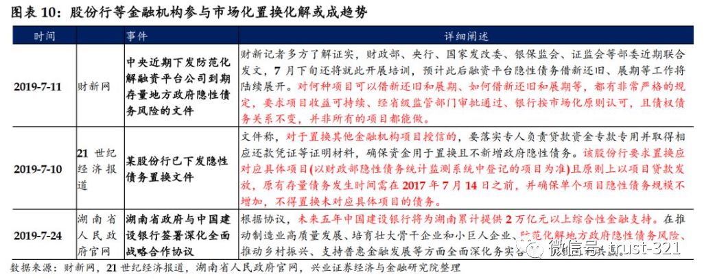 與望梅止渴的國(guó)開行相比,6月份以后,國(guó)有股份制大行參與化解隱性債務(wù)的節(jié)奏就在加快。據(jù)媒體報(bào)道6月20號(hào)前后,監(jiān)管部門已下發(fā)防范化解融資平臺(tái)公司到期存量地方政府隱性債務(wù)風(fēng)險(xiǎn)的意見。但由于文件涉密,至今并未對(duì)外公布。不過(guò)下半年股份銀行參與置換的節(jié)奏確實(shí)在加快。