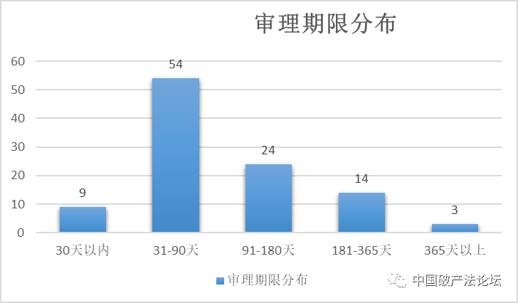 如圖1-6所示,公開檢索的裁判文書中,六個月內結案比例較高,占比超過80%。審理期限30天以內的9件,占比9%,審理期限31-90天的54件,占比52%,審理期限91-180天以內的24件,占比約23%,審理期限181-365天的14件,占比約13%,365天以上的3件,占比3%。有18件案或因裁判文書未顯示受理時間,未能統計到相關審限。