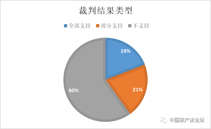 如圖1-8所示,以法院是否支持認定債權人申報的債權為共益債角度,23件全部支持債權人申報的共益債,占比19%;24件部分支持債權人申報的共益債,占比21%;73件不支持債權人申報的共益債,占比60%;另外有2件債權人未將債權認定為共益債明確列入訴訟請求,因此未統計進入前表。