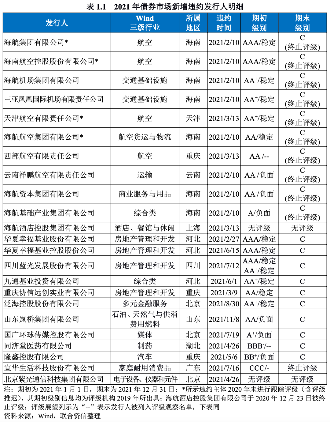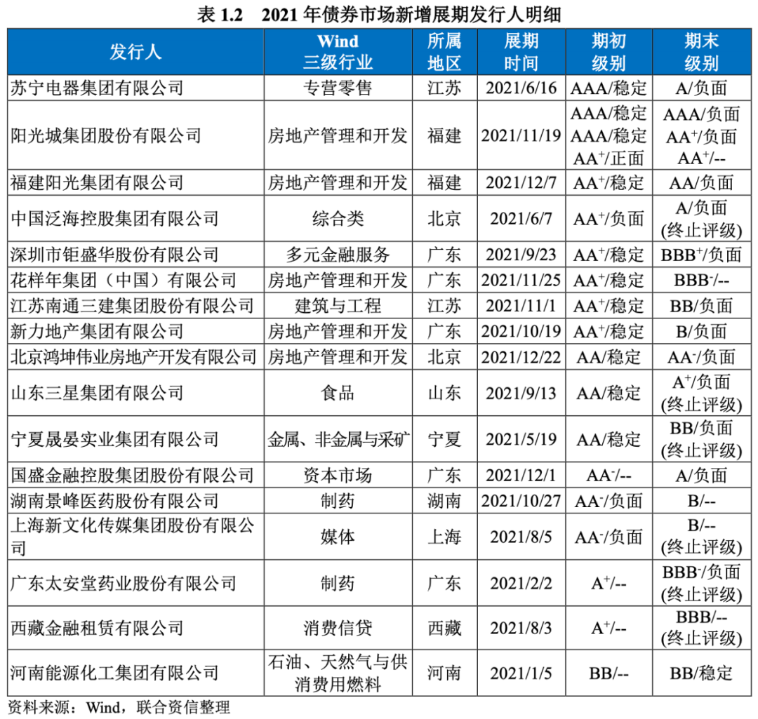 分季度來看,2021年一季度債券市場新增違約發行人13家,主要為海航系企業,二季度至四季度新增違約發行人數量較少,違約呈現零星散發狀態。此外,2021年我國債券市場部分風險主體(詳見表1.2)通過債券協商展期形式緩解到期兌付壓力,主要為房地產行業企業。