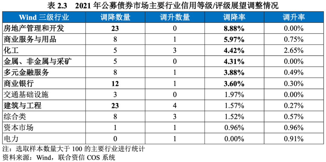 行業方面,信用等級/評級展望發生調降的發行人行業(Wind三級行業)分布整體較為分散,但房地產管理和開發行業(23家)、建筑與工程(23家,含城投企業及工程施工企業)以及商業銀行(12家)等行業的調降主體家數較多,其中遼寧、山西等地的弱資質農商行、城商行發生調降的數量相對較多。此外,房地產管理和開發、商業服務與用品、化工、金屬、非金屬與采礦、多元金融服務、商業銀行等行業的調降率相對較高,均高于市場平均水平(3.48%),詳見表2.3。
