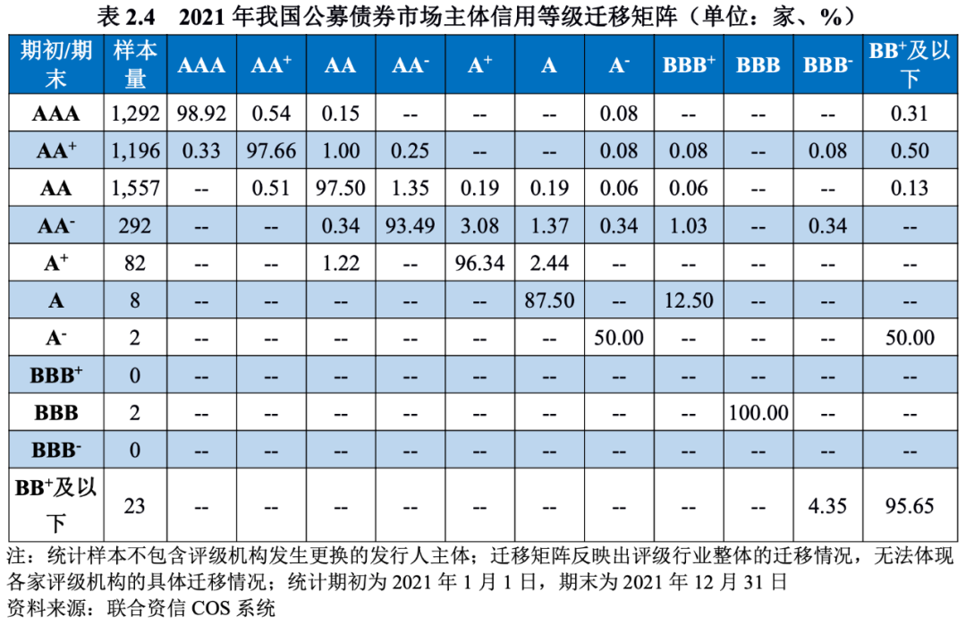 從信用等級遷移矩陣來看,在樣本數量較多的AA-級及以上級別中,各級別穩定性均較好,級別未發生遷移的比率均在90%以上,AA+級、AA級和AA-級穩定性較2020年和2019年均有不同程度上升;整體穩定性與2020年和2019年相比均有所提升。