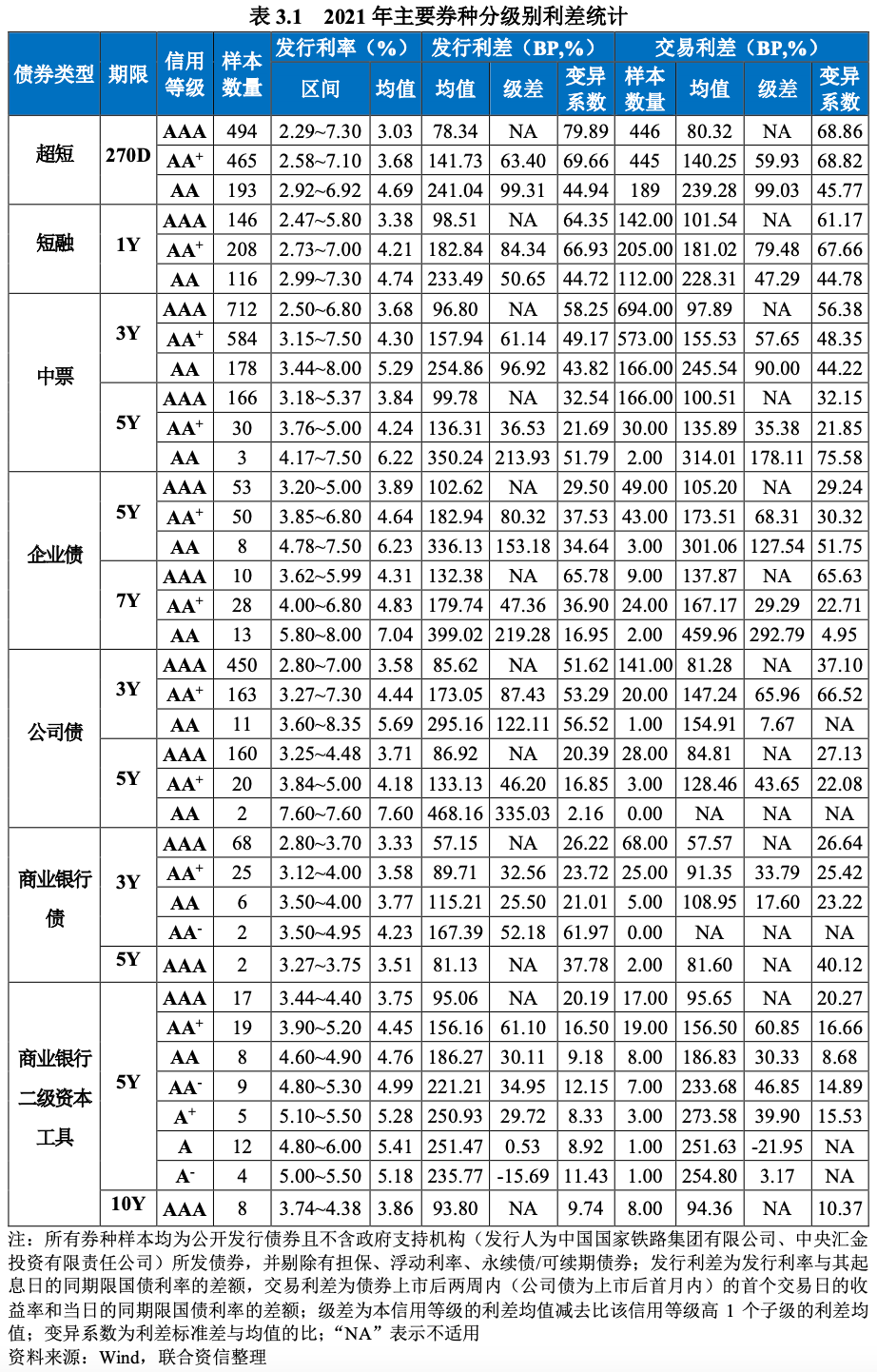 2021年,信用等級[11]與債券發行利率均值、利差均值基本呈負向關系,即信用等級越高,發行利率均值、利差均值越低。使用Mann-Whitney U兩獨立樣本非參數檢驗方法對樣本數量較多[12]的超短融、短融、中票、公司債、企業債、商業銀行債等的利差進行顯著性檢驗[13],參與檢驗的各級別主體所發超短融、短融以及各級別中票、公司債、企業債不同信用等級利差之間均存在顯著性差異,信用等級對信用風險表現出較好的區分度。