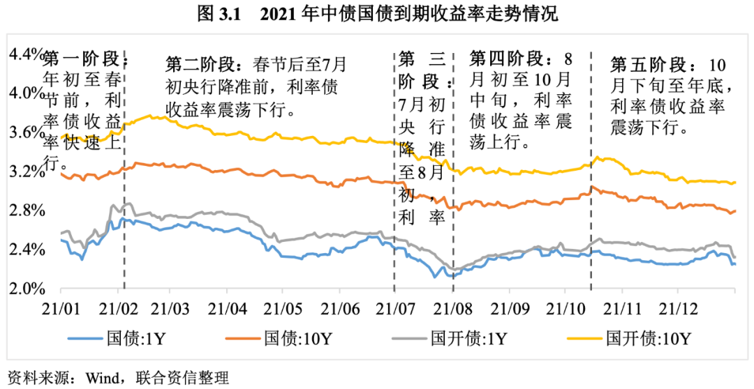 2021年,央行貫徹執行穩健的貨幣政策靈活精準、合理適度,通過靈活開展公開市場操作,熨平市場資金波動,市場資金波動幅度較過去3年降低。2021年利率債收益率總體呈“前高后低”態勢。從利率債收益率走勢看,主要分為五個階段。第一階段:年初至春節前,利率債收益率快速上行。隨著永煤違約事件對市場的沖擊逐漸消退及資金面實現平穩跨年,央行開始回收流動性,資金面逐步收緊,市場流動性預期由樂觀轉向謹慎,利率債收益率快速上行。第二階段:春節后至7月初央行降準前,利率債收益率震蕩下行。這一階段,央行貨幣政策堅持“穩字當頭”,資金面總體平穩偏松,加之地方政府專項債額度下發較晚且發行門檻提高導致機構面臨“資產荒”,利率債收益率呈震蕩下行態勢。第三階段:7月初央行降準至8月初,利率債收益率快速下行。進入2021年下半年,中國經濟下行壓力逐漸顯現,7月9日央行實施全面降準。全面降準在釋放流動性的同時帶動市場降息預期升溫,從而帶動利率債收益率快速下行。第四階段:8月初至10月中旬,利率債收益率震蕩上行。8月以來,地方政府債發行明顯提速,央行結構性寬松貨幣政策也加速推進,帶動市場寬信用預期不斷升溫,疊加結構性通脹壓力不斷抬升,利率債收益率震蕩上行。第五階段:10月下旬至年底,利率債收益率震蕩下行。在保供穩價政策支持下通脹壓力有所緩解,央行通過靈活主動的公開市場操作維持了市場流動性的合理充裕,12月央行二次降準落地、支農支小再貸款利率下調及1年期LPR下調進一步提振市場降息預期,利率債收益率震蕩下行。