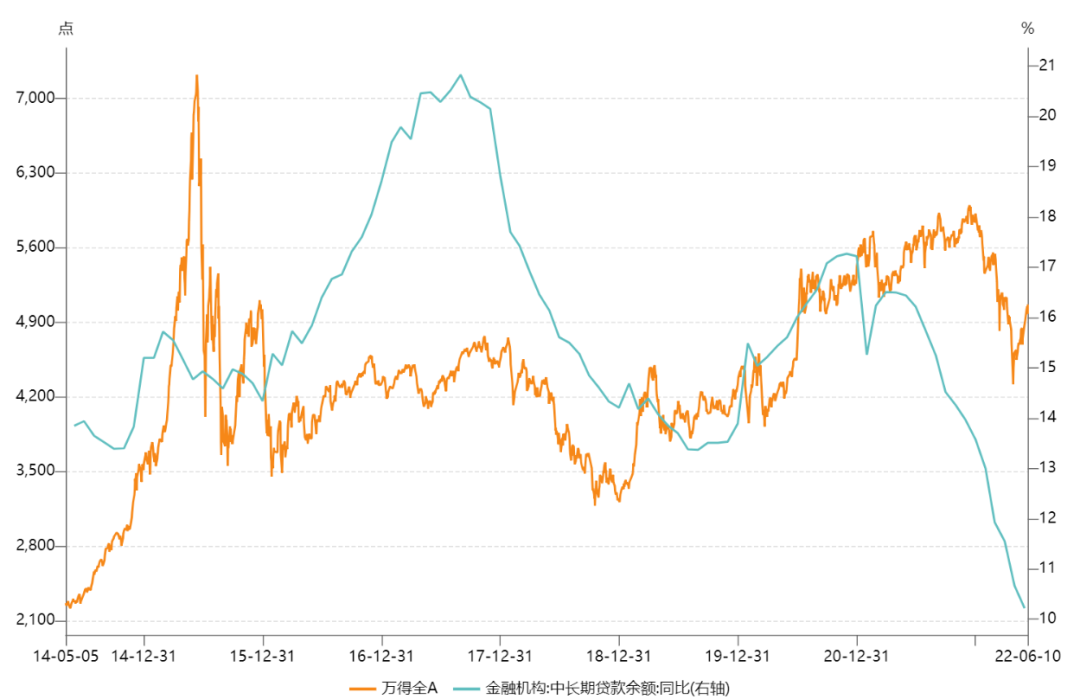 從數(shù)據(jù)上看就非常明顯,中長期貸款的同比增速是股市的先行指標(biāo),同比增速上行的階段股市往往是牛市。